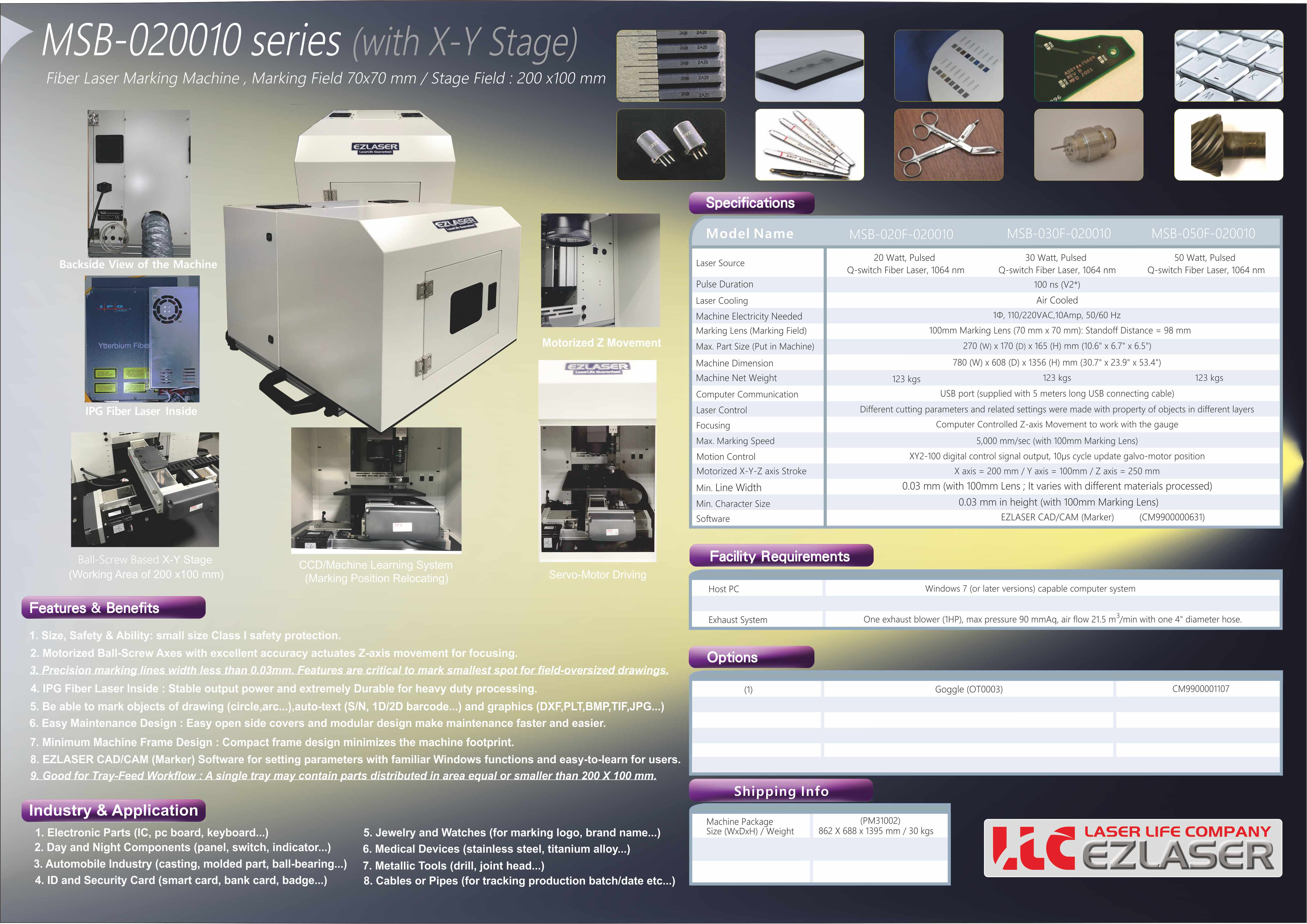 1. It is equipped with X-Y Stage constructed by high prevision ball-screw axis with strokes 200 x100 mm. That will extend the available marking area from field size (depending on f-theta lens applied ) of ex: 70mmX70mm to a larger 200 X 100 mm area with controllable position for processing spots. X-Y Stage with other strokes and different power levels of fiber laser will be negotiable to select.