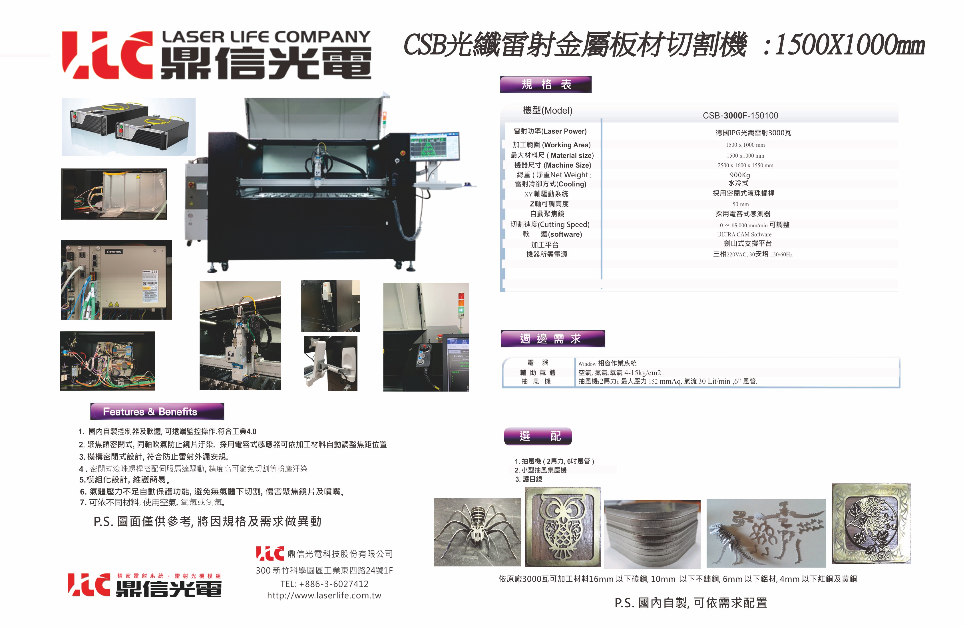 1. 雷射源: (德製) IPG YLR-3000 系列,波長:1070nm,輸出功率: 3000W。